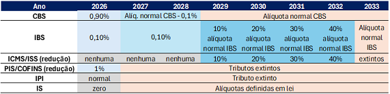 Mais do que isso: não haverá uma alíquota fixa, mas teremos alíquotas diferenciadas entre 2027 e 2033, e somente a partir deste último ano a alíquota desses tributos será estável.